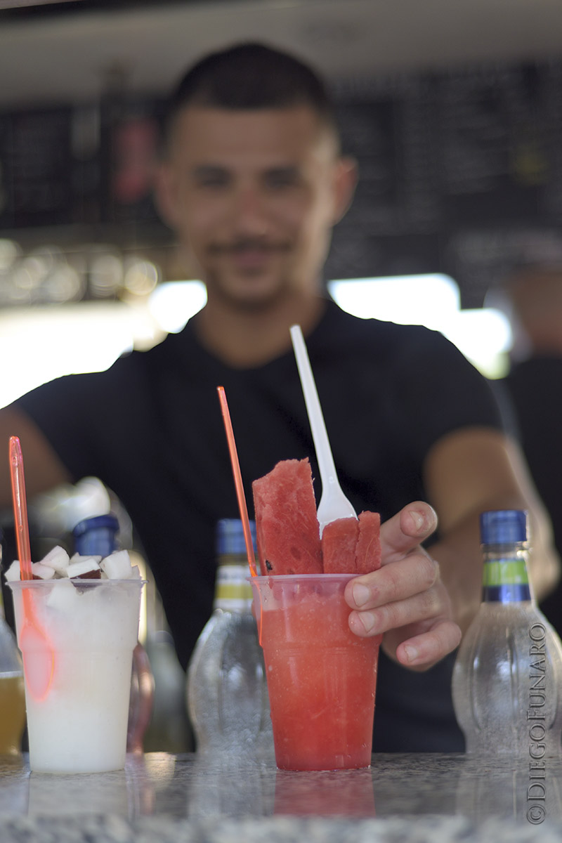 All’ombra del chiosco “La Sora Mirella” un grattachecaro consegna due grattachecche: una lemoncocco e una con cocomero