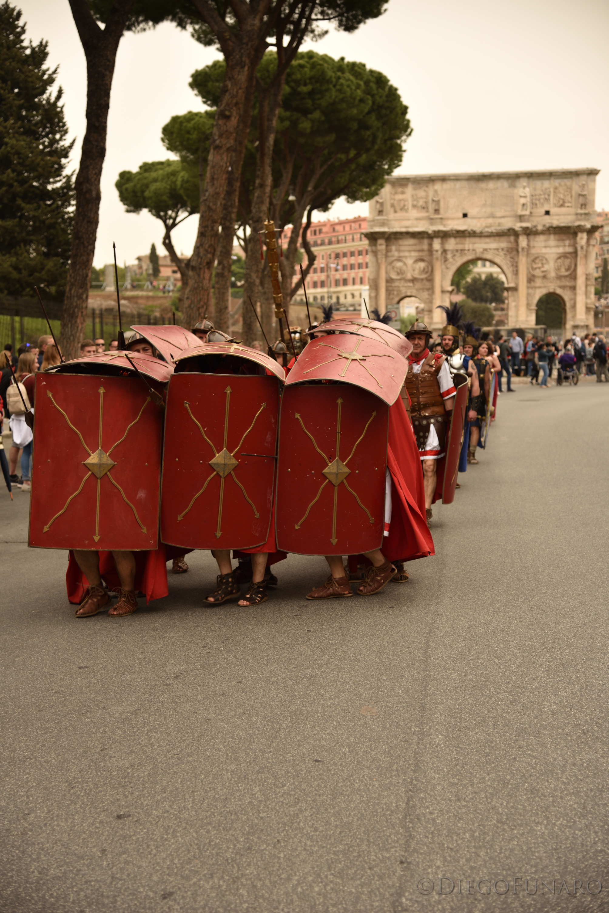 Un gruppo di centurioni nella celebre formazione di attacco e difesa detta “a testuggine” nelle vicinanze dell’Arco di Costantino